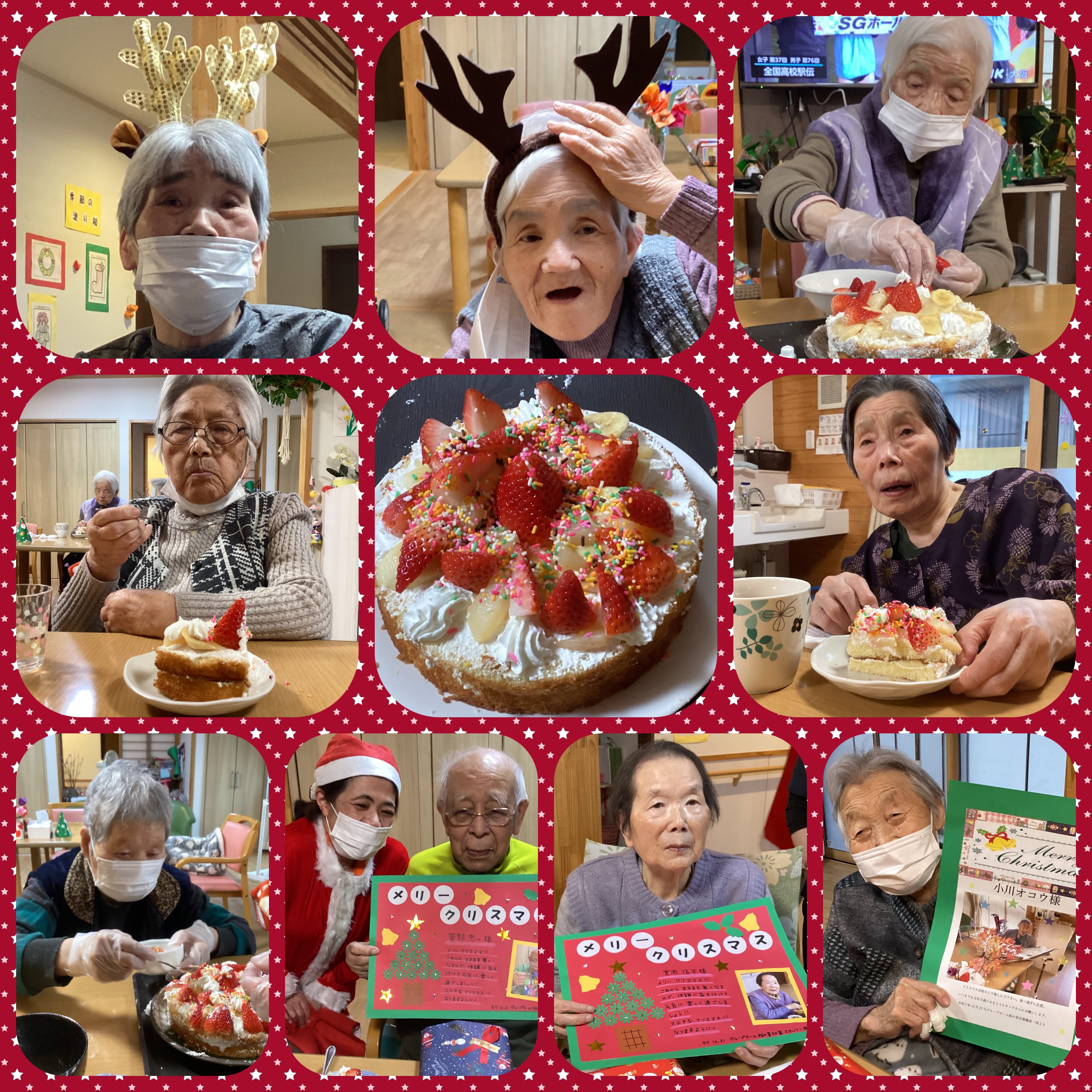 クリスマス会を行いました。利用者様と一緒にケーキを作りました。いちごがいっぱいでとてもカラフルなケーキでした。おいしいケーキを食べて、サンタさんからプレゼントとクリスマスカードをもらって、皆様とても喜ばれておりました。